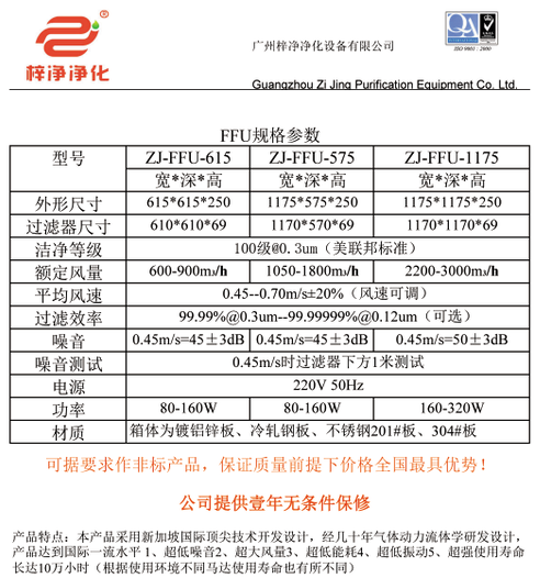 標準FFU一般是按照市場需求的風量廠家內定的FFU尺寸,本文主要介紹一下梓凈公司的標準FFU尺寸。