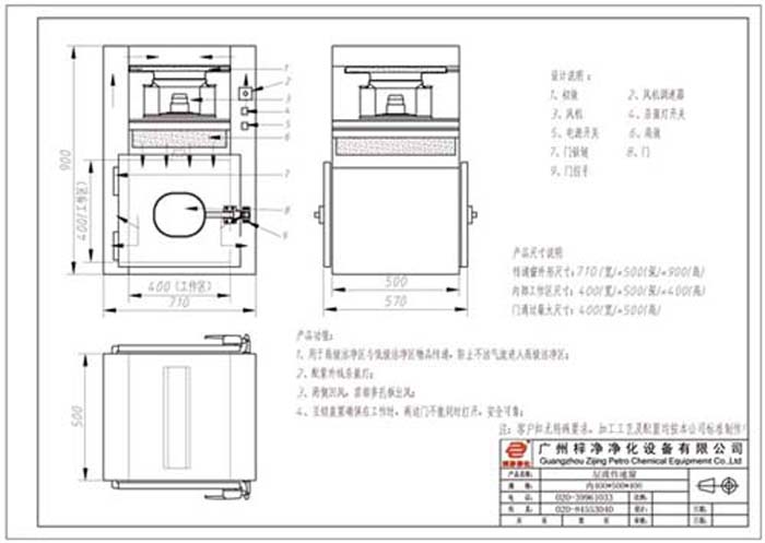 7、控制功能:風機啟動/停止按鈕,配置內置式電子門互鎖;設置紫外燈,設計單獨開關,當兩扇門關上時,紫外燈應出于開啟狀態;設置照明燈,設計單獨的開關;