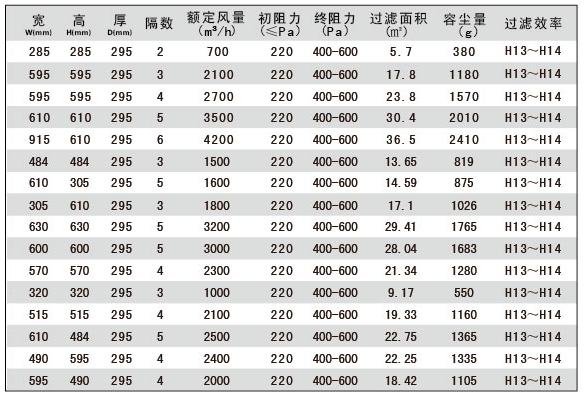 過濾效率:99.99%-99.995%(H13、H14) MPPS