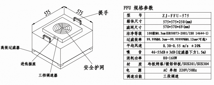本產(chǎn)品主要介紹我司生產(chǎn)的575*575*320規(guī)格的FFU,型號(hào):ZJFFU575,圖文結(jié)合更清晰,讓您更好更多的了解我司生產(chǎn)的ZJFFU575產(chǎn)品。