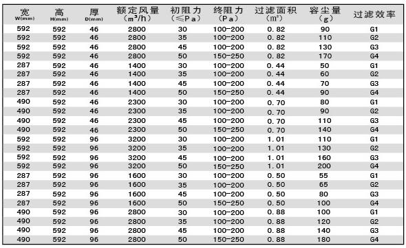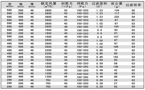 過濾效率:G1:40%@5.0μm、G2:65%@5.0μm、G3:85%@5.0μm、G4:90%@5.0μm(計重法);